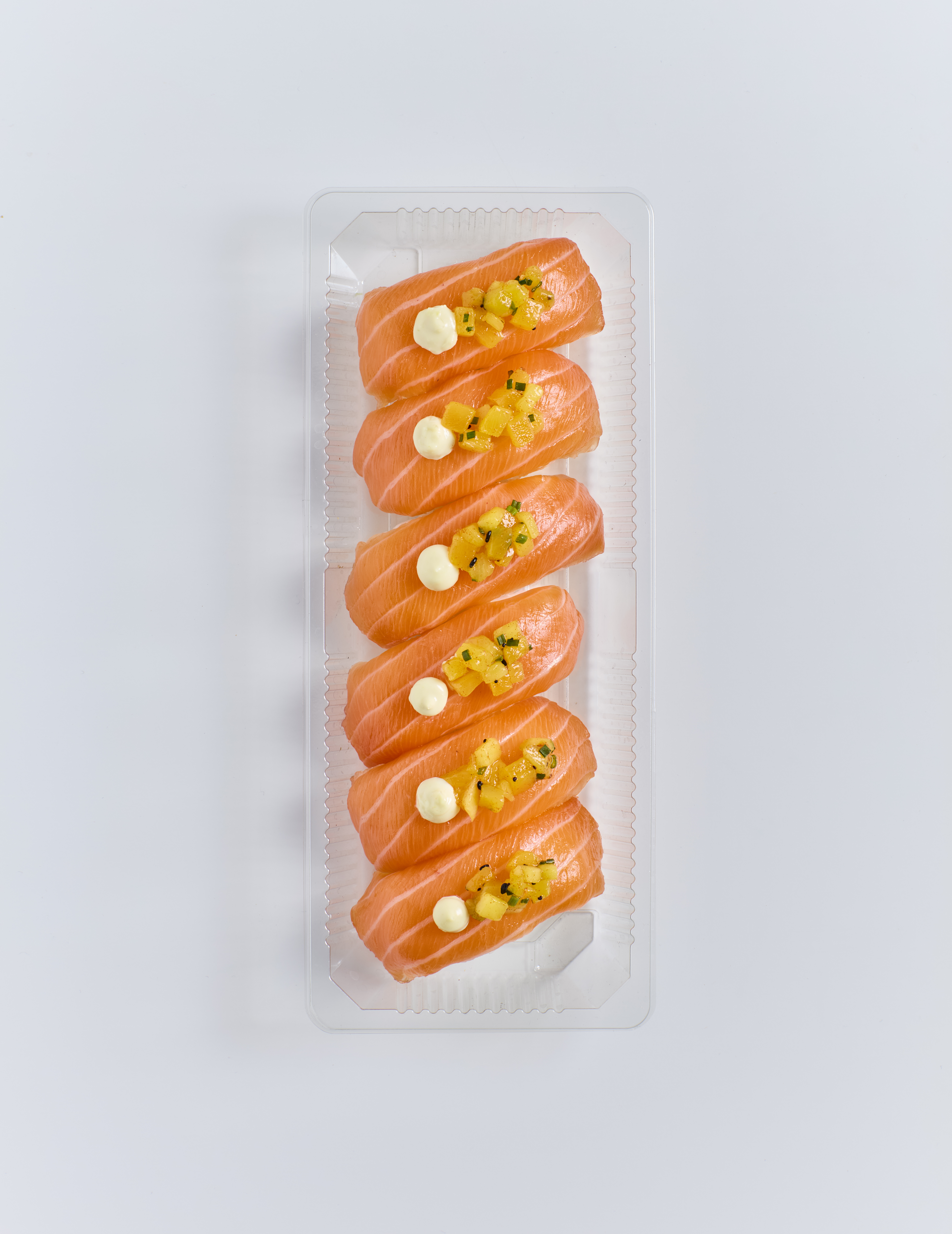 Til je nigiri ervaring naar een hoger niveau met een levendige topping van pittige mangosalsa en wasabi-mayonaise. Een gedurfde hap van zoet en pittig, het soort upgrade dat je nooit meer wilt missen.