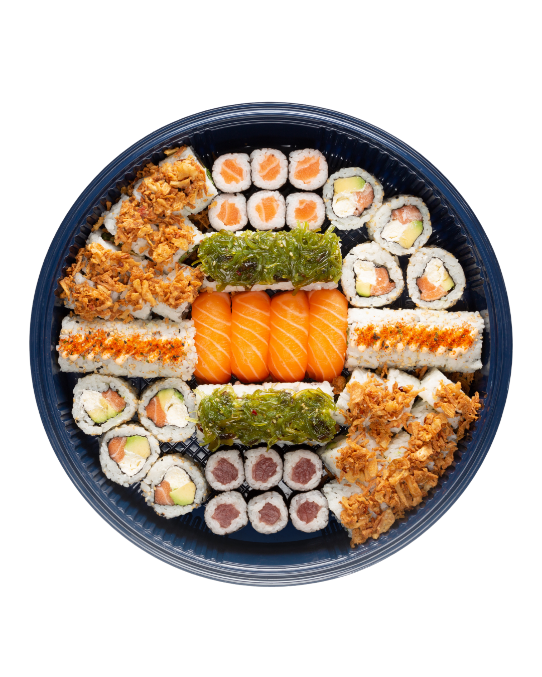 Nuestra bandeja de sushi Top Mix XXL es perfecta para compartir y disfrutar. Incluye 56 piezas de nuestro sushi cuidadosamente preparado: makis (6 de salmón y 6 de atún), rolls (8 Crunch Cali, 8 Spicy Cali, 8 Cheese Salmon, 8 Crunch Pollo y 8 Wakame Salmón) y 4 nigiris de salmón. Compártela con tu familia. Compártela con tus amigos; hay sushi para todos.